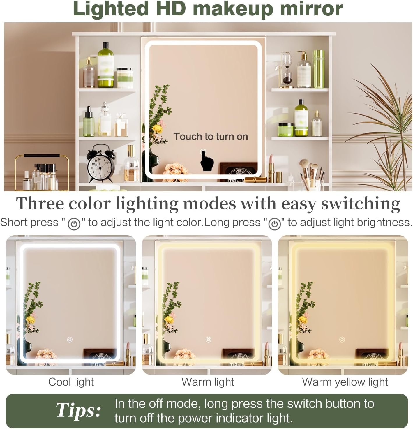 - 【3-Color LED Light】The vanity desk features a specially shaped dimmable lighting mirror with 3 different LED lighting colors, including natural, warm and cool light, for a variety of indoor lighting and environments to optimize your makeup