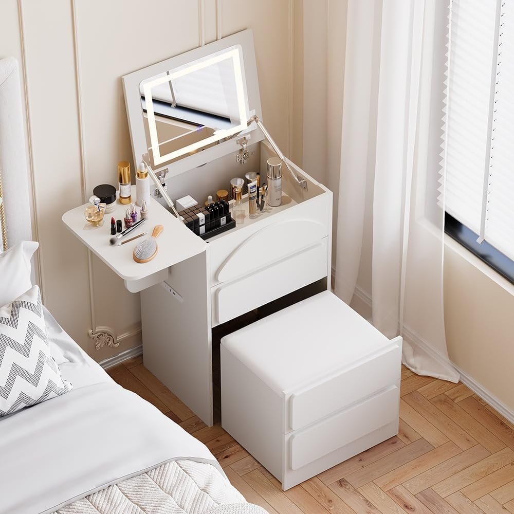 • [LED Tri-Color Flip-Top Mirror]- Enjoy flawless makeup application with a white vanity set featuring an adjustable LED tri-color mirror. Switch between warm, neutral, and daylight settings for perfect lighting