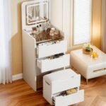 - compact vanity – small vanity: 💄💻📚【3 IN 1 : Makeup Table & Nightstand & Laptop Desk】- vanity table set is equipped with a flip-up mirror, which can be turned into a makeup desk in seconds. When the desk top is folded down, it is a simple writing table or nightstand. Large Capacity:This make-up desk features a mirror cabinet and 3 large drawers and a spacious top with shelves above provides plenty of storage space and kes everything you need within easy reach. Versatile 3 in 1 vanity desk: This 3 in 1 vanity desk with flip top mirror serves as a vanity desk, writing desk, and nightstand all in one, making it perfect for small spaces and maximizing functionality in your bedroom.